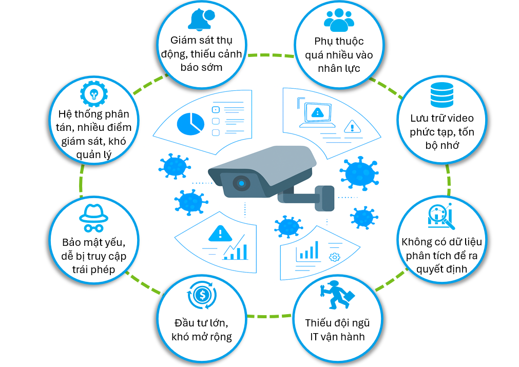 Cùng với sự phát triển của hạ tầng, số lượng camera, chi nhánh và dữ liệu tăng nhanh khiến các doanh nghiệp gặp nhiều rào cản trong quản trị an ninh tổng thể như hệ thống phân tán, khó quản lý tập trung, dữ liệu lớn tốn dung lượng, khó backup, bảo mật yếu, phụ thuộc nhân sự vận hành, chi phí cao,…